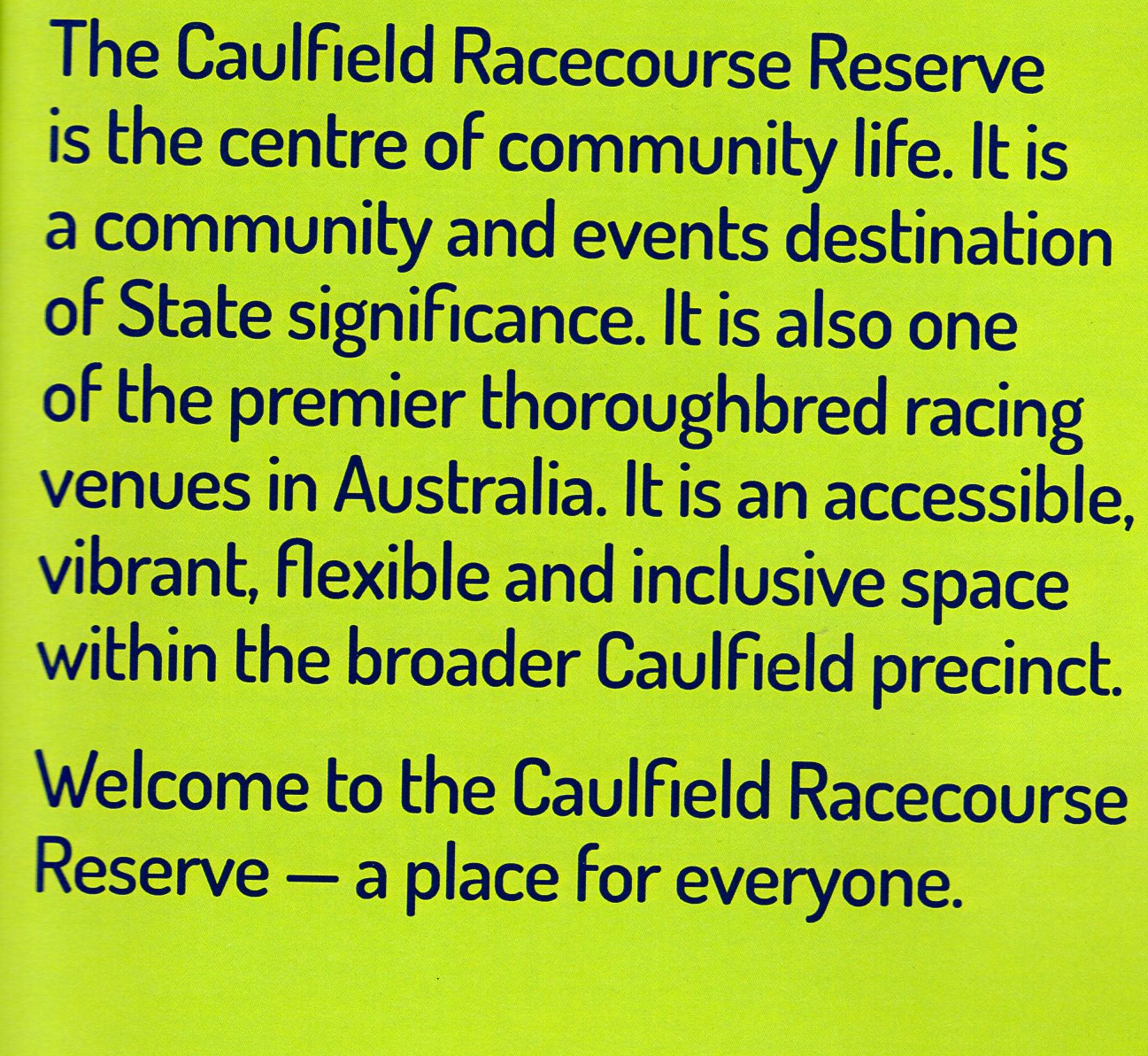 \Why is the Caulfield Racecourse Reserve and transport hub under-utilised? State and Federal expenditure can be efficiently targeted to show off and develop this valuable public land, located at this principal activity centre. Benefits to both racing and the wider community can be maximised, including a public park, a regional shopping centre for the inner city based on public transport access and regional recreational facility. The Reserve comprises is crown land, designated for public recreation and for racing. Horse training should be retained at the Reserve and made a feature of this Reserve. The area from Stonnington to the Racecourse over the railway lines and Dandenong Road could be developed into a major low rise shopping plaza over three floors.